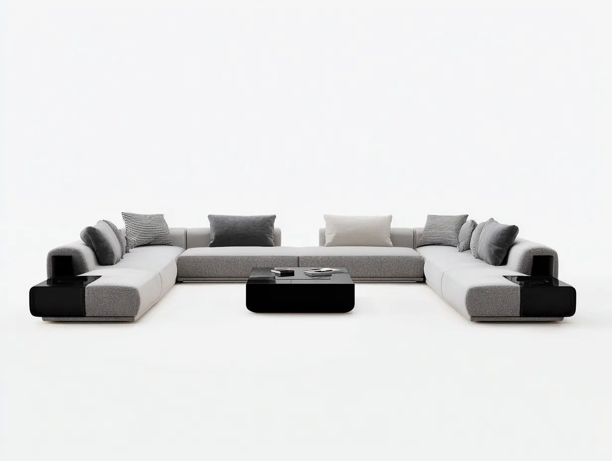 Dieses moderne modulare Sofa ist fuer grosszuegige Wohnraeume konzipiert und wird durch einen passenden Couchtisch ergaenzt. Die klare Linienfuehrung und die niedrige Bauhoehe unterstuetzen ein zeitgemaesses Erscheinungsbild und bieten vielseitige Nutzungsmoeglichkeiten im Wohnbereich.